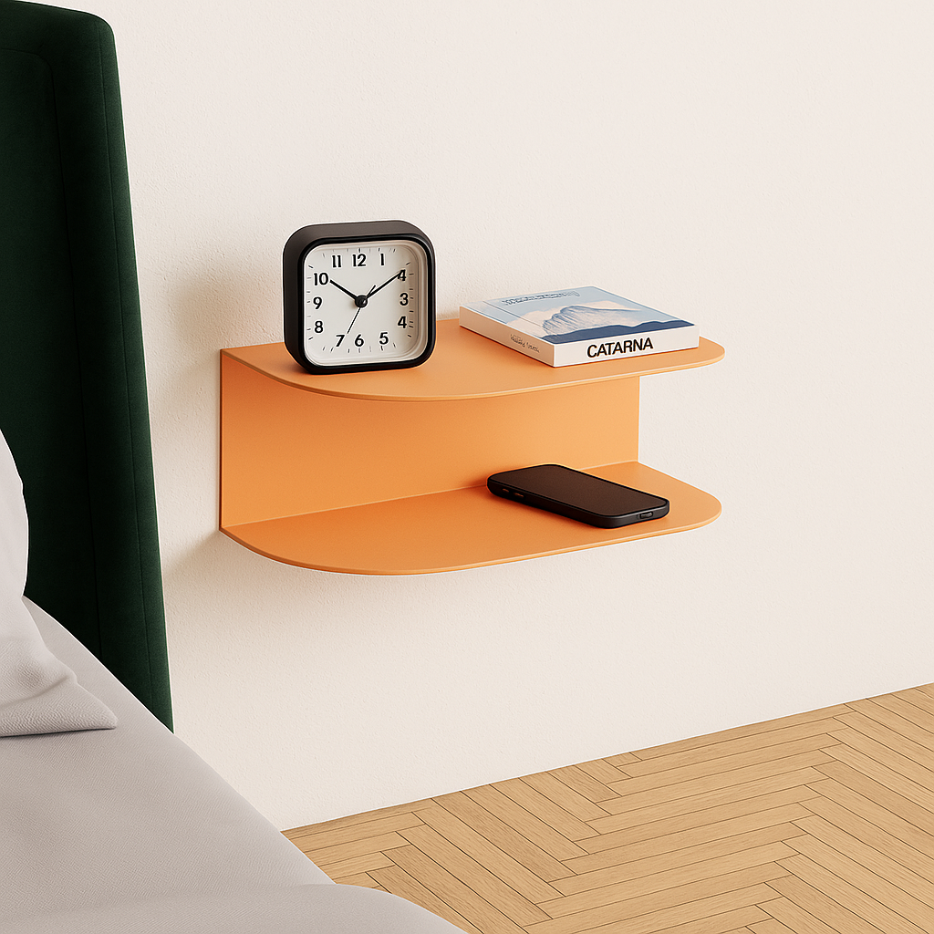The Quarter Metal Night Stand is a space-saving, wall-mounted shelf designed to keep your nighttime essentials organized. With its sleek double-bend design and powder-coated finish, it adds a touch of modern style to any bedroom.